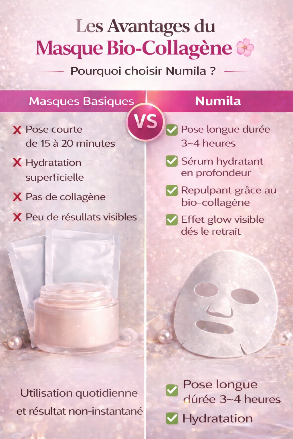 "Je vous recommande vivement le masque Bio-Collagène de chez Numila pour le visage ! Il hydrate intensément, resserre les pores et raffermit la peau pour un teint plus lisse et éclatant. Un véritable allié pour une peau visiblement plus jeune, radieuse et pleine de vie."